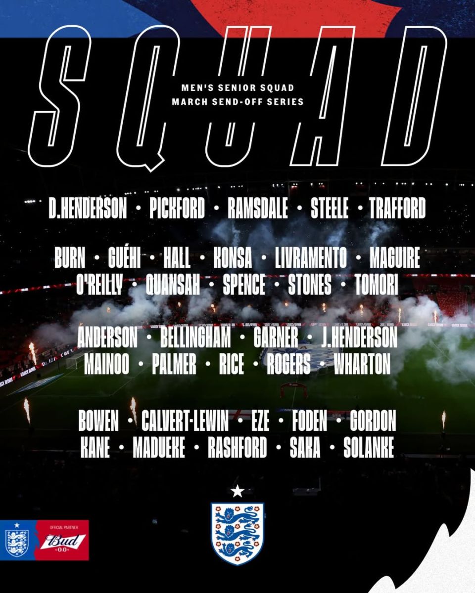 Кўриниб турибдики, рўйхатда Жуд Беллингем ҳам бор, гарчи у жароҳат сабаб анча вақтдан бери ўйнамаган бўлса ҳам. Аммо янада ҳайратланарлиси — "Брайтон"нинг 35 ёшли дарвозабони Жейсон Стилнинг чақирилиши. У жорий мавсумда фақат Англия Кубоги ва Лига Кубогида майдонга тушган.