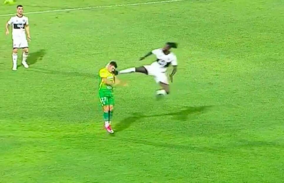 Emmanuel to'p uchun kurashda raqibining elkasiga butsasining ost qismi bilan zarba berdi.