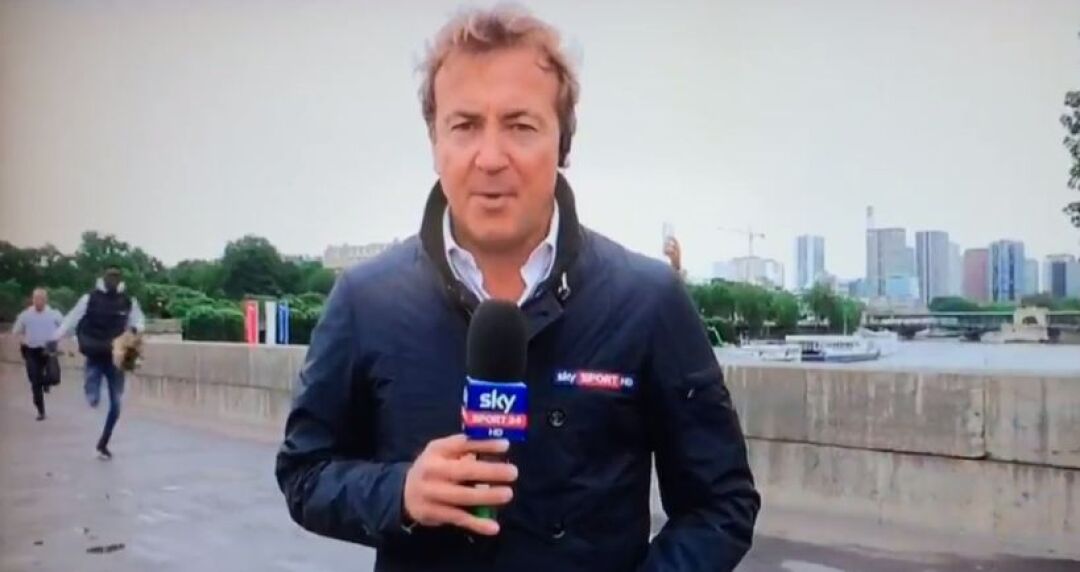 "Sky Sport Italia" муҳбири Ангело Манжианте жонли эфирда ишлашни бошлади ва кутилмаганда қора танли йигит қўлида сумка билан журналистнинг орқасидан ўтиб кетди. Франциялик полициячилар эса уни қувишаётган эди. Ангело эфирни тўхтатмади ва сўзларини давом эттирди.