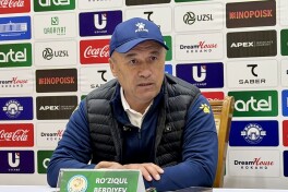 Матбуот анжуманида Рўзиқул Бердиевга "Насаф" - "Ал Садд" учрашувининг энг яхши футболчиси деб топилган дарвозабон Санжар Қувватов ҳамрохлик қилди.