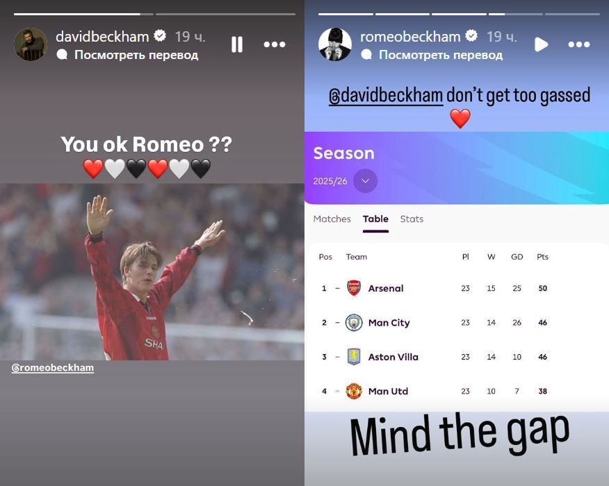 23 yoshli Romeo Bekxem esa otasining bu "hujumi"ga tezkorlik bilan javob qaytardi. U APL turnir jadvali aks etgan skrinshotni joylab, shunday yozdi: "Juda ham bo'shashib ketmang. Tuzoqqa tushib qolmaslik uchun ehtiyot bo'ling".