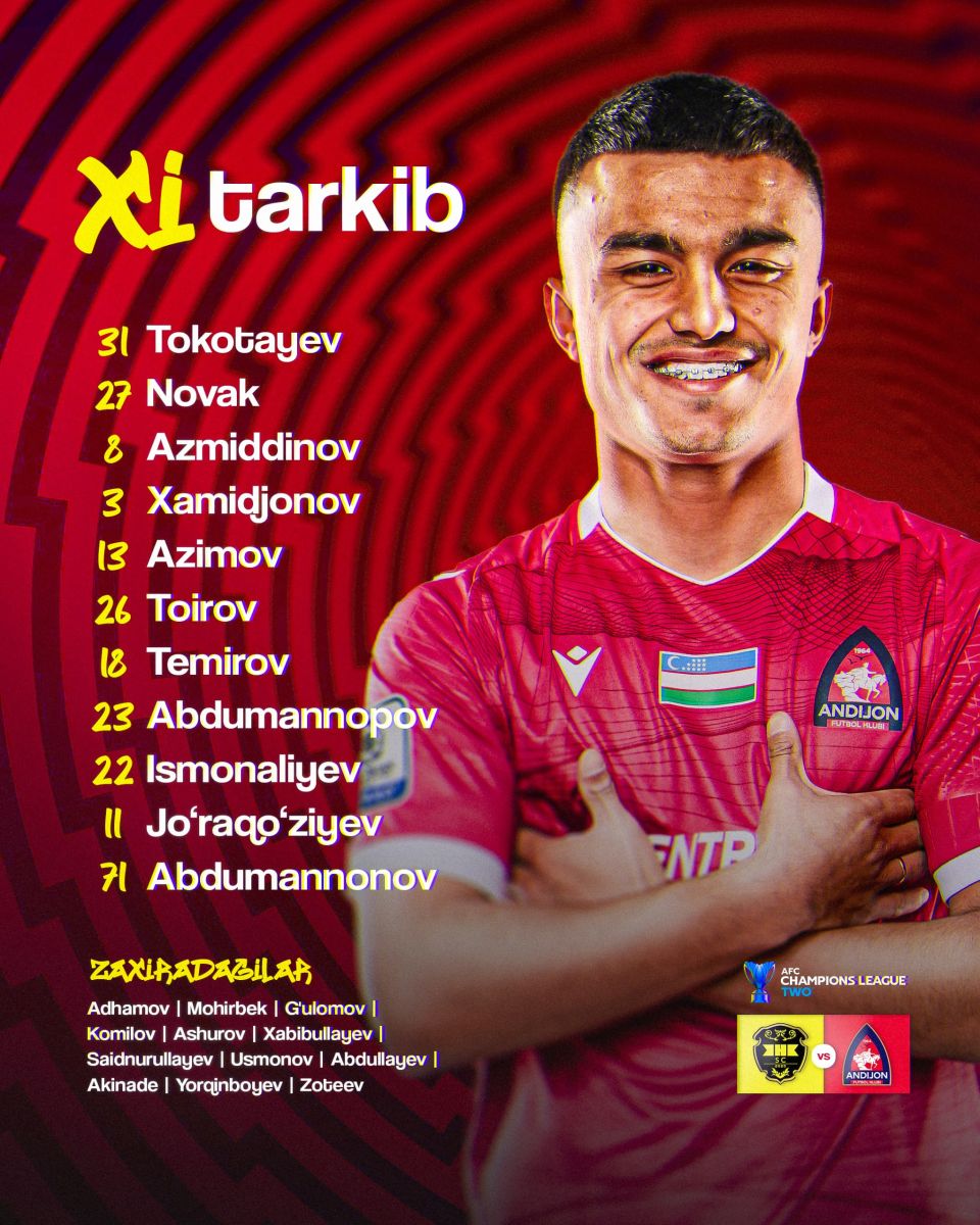 "Андижон": 31. Токотаев Ержан, 3. Хамиджонов Суннатуллох, 8. Шаҳзод Азимиддинов, 11. Отабек Журақўзиев, 13. Азимов Сардорбек, 18. Дамир Темиров, 22. Усмонали Исмоналиев, 23. Дониёр Абдуманнопов, 26. Мухаммадкарим Тоиров, 27. Кристиан Новак, 71. Бектемир Абдуманнопов.Захира: 1. Элдор Адхамов, 2. Абубакр Ашуров, 5. Ғуломов Абдулвоҳид, 7. Исмаил Акинаде, 9. Саидмуродхон Саиднураллаев, 12. Комилов Мохирбек, 14. Абдураҳмон Комилов, 16. Абдураҳмон Абдуллаев, 21. Асадбек Хабибуллаев, 33. Олег Зотеев, 88. Шохжахон Ёрқинбоев, 99. Муҳаммадали Усмонов.