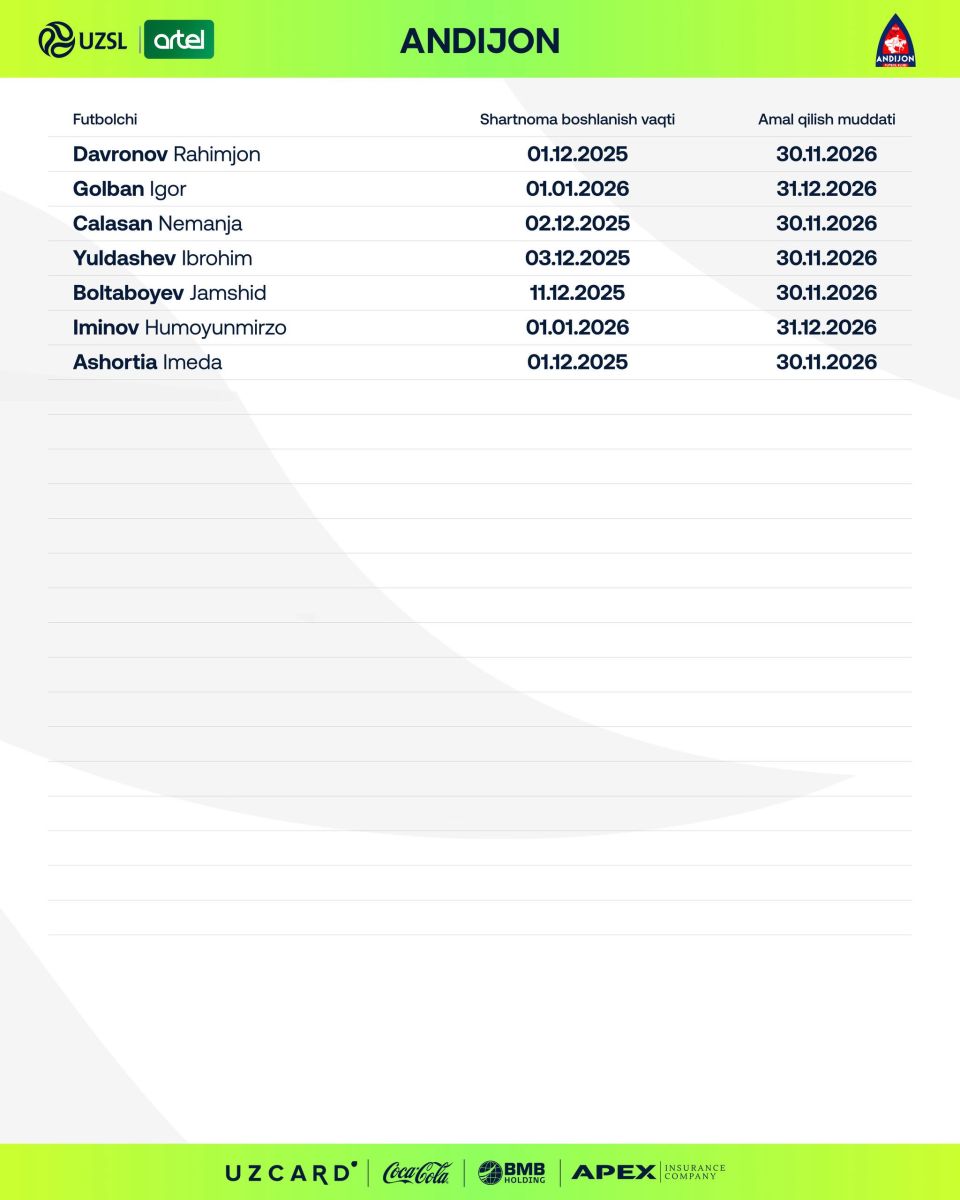 Унга кўра, "Андижон" Ҳумоюнмирзо Иминов ҳамда Иброҳим Йўлдошев ҳам "Андижон" аъзосига айланган.