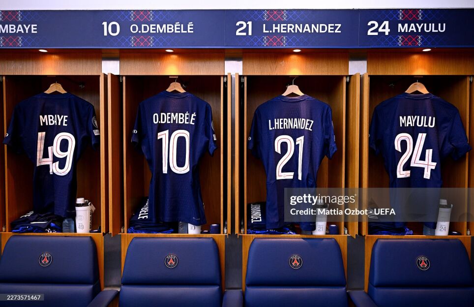 "Пари Сен-Жермен": Сафонов, Хакими, Маркиньос, Пачо, Мендеш, Заир-Эмери, Витинья, Невеш, Дуэ, Дембеле, Кварацхелия.