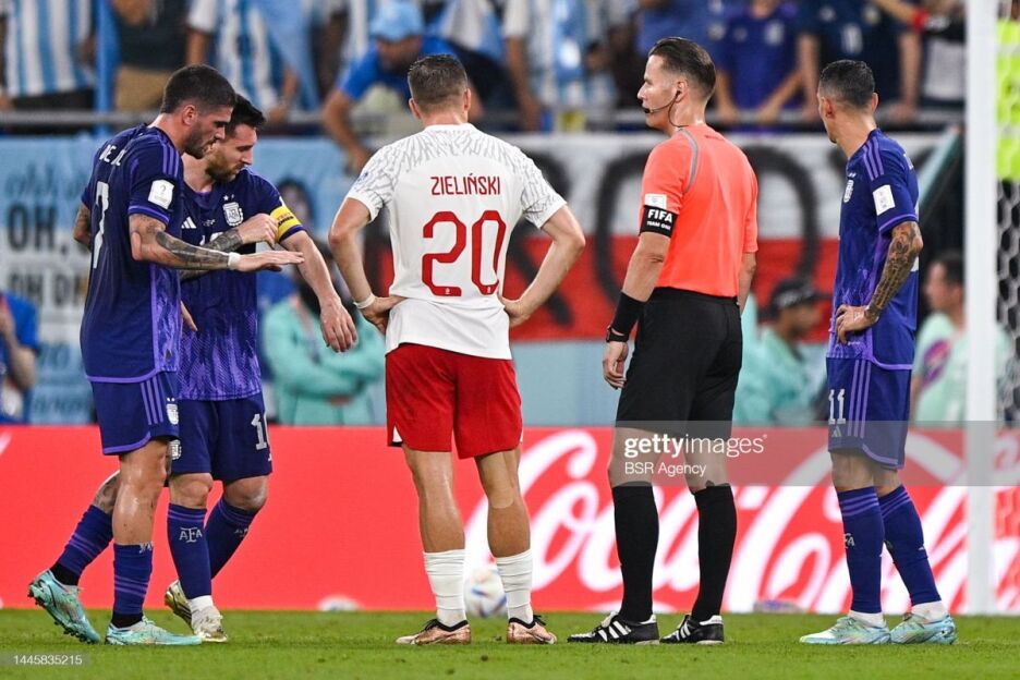 Польша – Аргентина (0:2) ўйинининг 35-дақиқасида бош ҳакам Данни Маккели видеотакрорни томоша қилиб, Войцех Шесни ҳаводаги тўп учун кураш натижасида Лионель Мессининг юзига қўли билан зарба бергани учун пенальти белгилади.