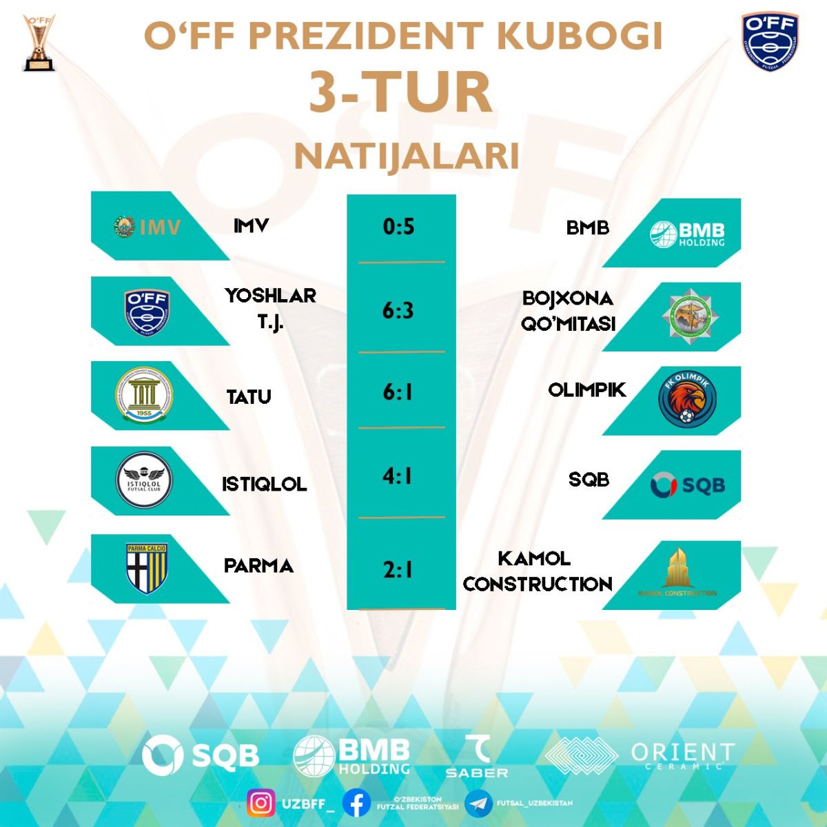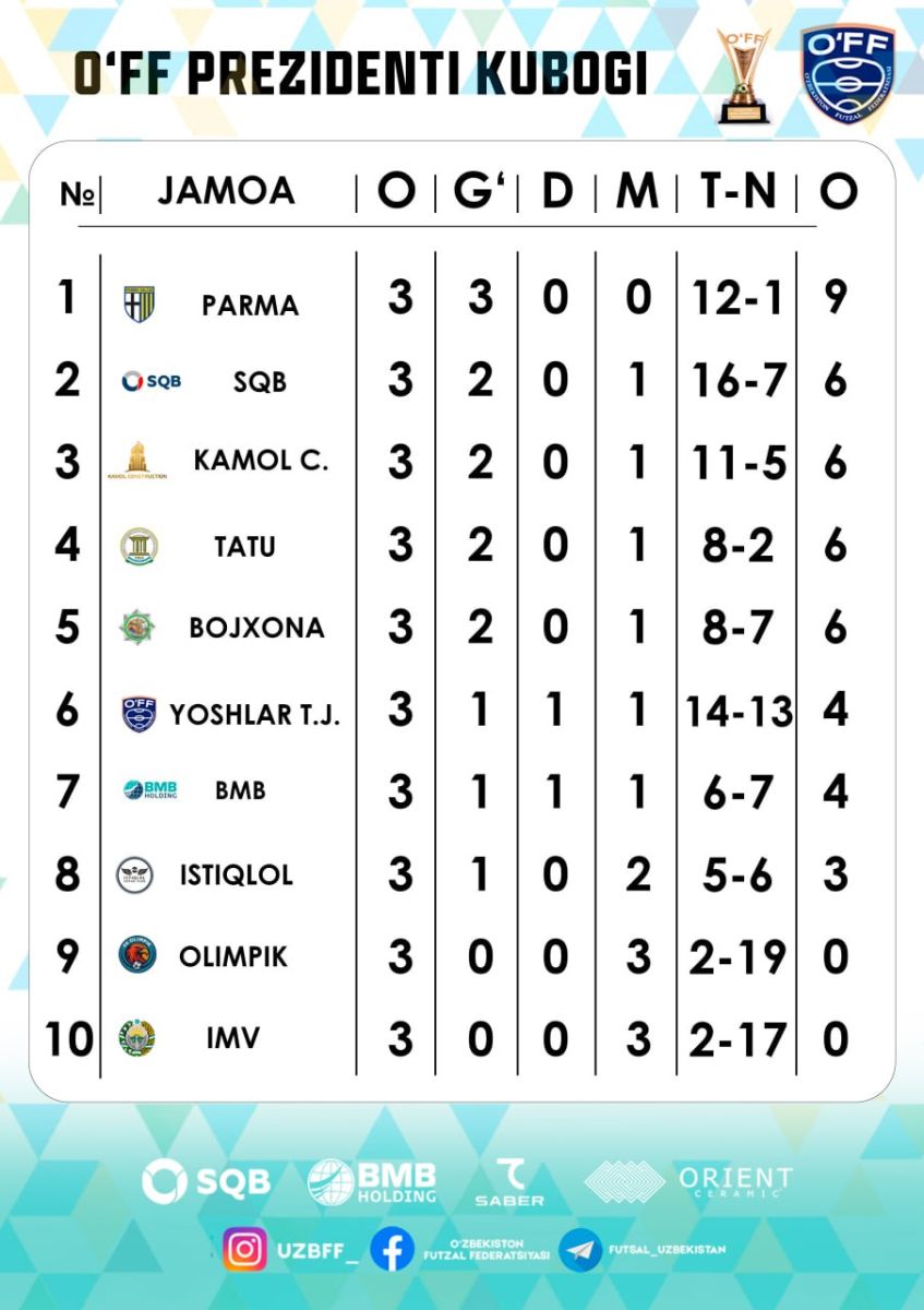 Муҳаммад ал-Хоразмий номидаги Тошкент ахборот технологиялари университети спорт залида футзал бўйича "ЎФФ Президенти кубоги – 2025/2026" мусобақасининг 3-тур учрашувлари бўлиб ўтди.