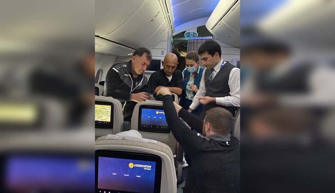 Жиддадан учган самолёт бортида 90 ёшли эркак киши ўзини ёмон ҳис қилган. Самолёт учувчиси шифокор кераклиги ҳақида эълон берган ва Ўзбекистон терма жамоаси шифокори Алишер Арипов дарҳол унга ёрдам берган.