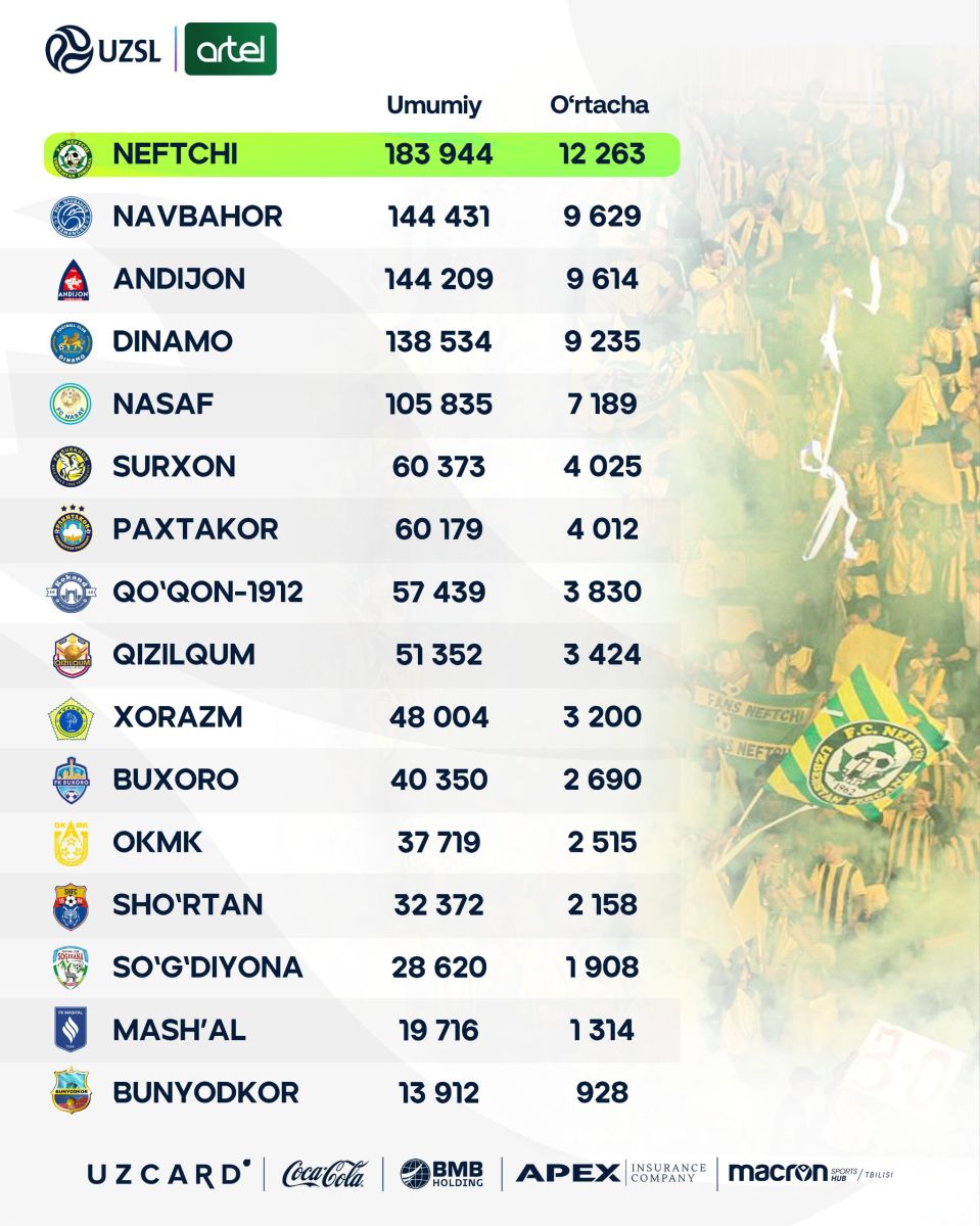 ПФЛ матбуот хизмати жорий мавсум Суперлига жамоалари қанча мухлис тўплай олгани ҳақида маълумот эълон қилди.
