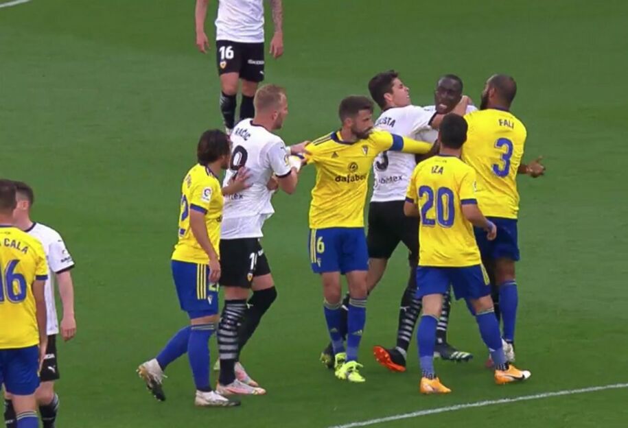 Гап шундаки, "Валенсия" жарима майдонида "Кадис" ҳимоячиси Хуан Кала (у ўйинда ҳисобни очган) ва Муктар Диакаби тўп учун кураш олиб борган. Кўринишидан ўша вазиятда шунчаки кураш борган, бироқ воқеа кескин тус олиб, футболчилар бир-бирларини ҳақоратлаб кетишган. Бу ҳолатда ҳар икки футболчига сариқ карточка берилган.