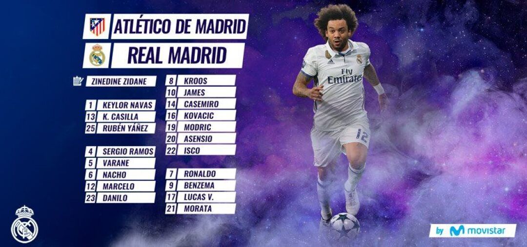 "Реал Мадрид" жамоасининг "Атлетико"га қарши 19 нафар футболчидан иборат таркиби қуйидагича.